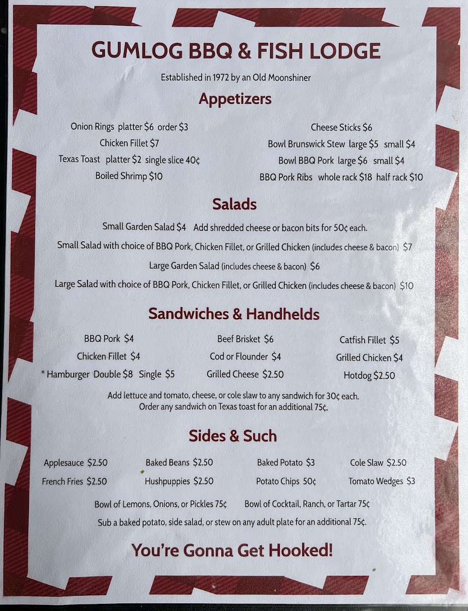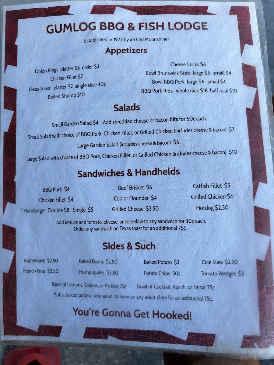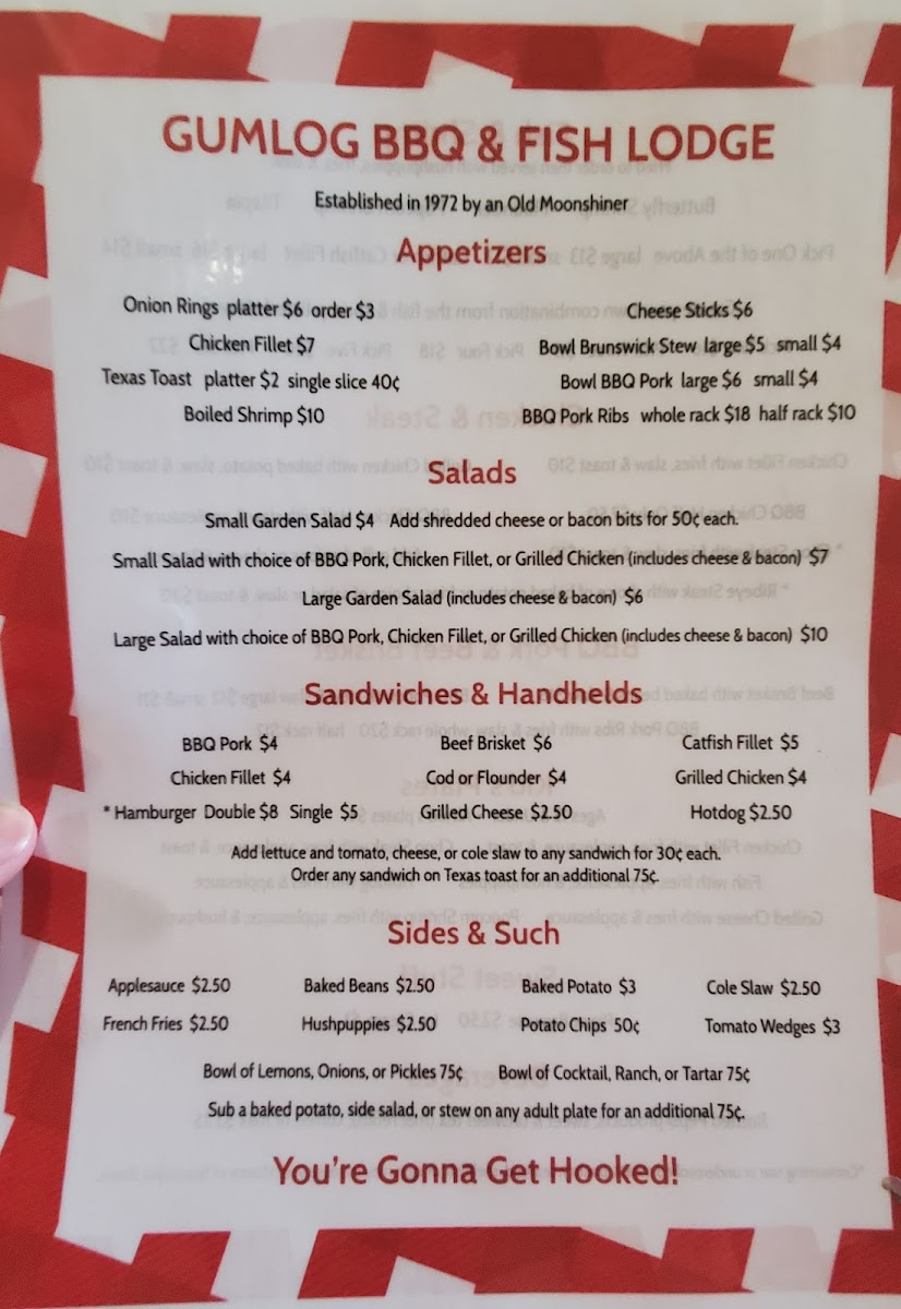 Located in Lavonia, Georgia, the Gumlog Bar B Que & Fish Lodge offers a menu that embodies Southern comfort food at its finest. The Gumlog Bar B Que & Fish Lodge Menu is a haven for fans of slow-cooked meats and crispy seafood, with a clear emphasis on tradition, generous portions, and down-home flavor.